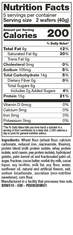 Ingredients: Protein blend (milk protein isolate, hydrolyzed gelatin, whey protein isolate), wheat flour, fractionated palm and palm kernel oil, sugar, fructose, milk ingredients (skim milk, milk, cream), cocoa butter, unsweetened chocolate, soy lecithin, whole egg powder, soy flour, sunflower oil, water, natural and artificial flavors, salt, sodium bicarbonate, sucralose (non-nutritive sweetener), corn flour. May contain tree nuts.